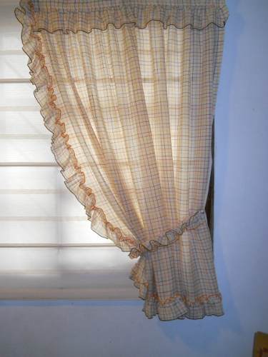 Dos paños iguales de cortina de 80 x 1,25 cm, con tiras para sujetar a ambos lados. Tela con diseño de cuadrillé en colores marron, naranja y amarillo, con ribetes bordados en esos colores. Tiene muy poco uso, la tela está impecable.